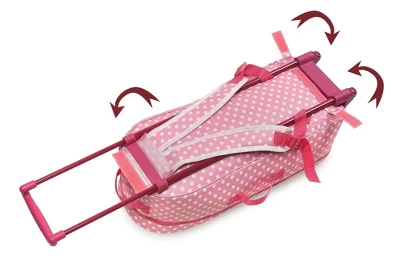 Badger Basket’s 3-in-1 Trolley Doll Carrier with Rocking Bed and Bedding gives you three options for taking your doll anywhere! Pull your doll along, with her clothes and accessories, on the smooth rolling trolley or remove the carrier from the trolley frame and carry your treasured friend using the grab-and-go tote handles on the top and side. If you need your hands free, the carrier also has adjustable, padded backpack straps for transporting your doll in comfort and style on your back! Use the folding, 2-in-1 travel bed in either a rocking or a stationary position. Cardholder on the front for adding a name or address tag (paper card not included). Four, elasticized, mesh pockets inside the carrier help with sorting and organizing your doll’s small and special things, or your sleepover gear. Trolley has a height adjustable pull handle, and two, smooth-rolling wheels. Carrier attaches to the trolley with three hook-and-loop straps and easily removes from the trolley frame to carry separately. Clear, heart-shaped vinyl window on the front so you can see in (or your doll can see out!). Bed assembles simply by unfolding it and inserting the platform panel. Padded backpack straps for your child’s comfort adjust as your child grows. For Dolls up to 18 inches. Fits 18-inch dolls such as American Girl, My Life As, Madame Alexander, and Our Generation; and fits 15-inch American Girl Bitty Baby dolls and 14.5-inch American Girl WellieWishers dolls. Travel Case and Pillow made with 100% Polyester fabric with 100% Polyester filling. Blanket and Bed made with 100% Polyester fabric. Bed has internal cardboard support panels. Trolley frame made with steel metal and recyclable PP plastic. Strap adjustment buckles made with PP plastic. Overall assembled dimensions 9 inches L x 6.5 inches W x 22.5 inches H (30 inches H with handle extended). Travel case: 9 inches L x 5 inches W x 20.5 inches H. Trolley frame: 7 inches L x 6.5 inches W x 22.5 inches H (30 inches H with handle extended). Bed: 19.5 inches L x 11 inches W x 7 inches High (interior of the bed is 19 inches L x 10.5 inches W). Pillow: 8 inches L x 4.5 inches W x 1.5 inches H. Blanket: 18.5 inches L x 14.5 inches W. Length of backpack straps from top to bottom at maximum extension is 24 inches (minimum extension is 15 inches). Padded straps are 2 inches wide. Webbed, adjustment straps are 1 inch wide. Assembled weight: 3 pounds. All measurements approximate and can vary whether the case is empty or filled. Spot clean travel case and travel bed as needed with a damp cloth and mild detergent. Allow to air dry. Do not heavily soak nor immerse the travel case or the travel bed in water. Hand wash pillow and blanket and allow to air dry. Do not store the Travel Case where it is below freezing temperatures because it may cause damage to the clear PVC-vinyl viewing window. Adult assembly required (no tools needed). Illustrated instructions included. For children from three years old and up. This toy is for dolls only and is not for use with real infants or pets. /! WARNING: CHOKING HAZARD – Small parts. Not for children under 3 yrs. Product complies with all currently applicable safety standards. Product includes a limited warranty of 30 Days Parts to the original purchaser. Doll and doll clothes/accessories not included. Product may vary slightly from shown and described. Props/accessories shown are for illustration purposes only and are not included with the product. Actual color/finish may vary slightly from screen display. This item ships in its original carton that may include a product photo.