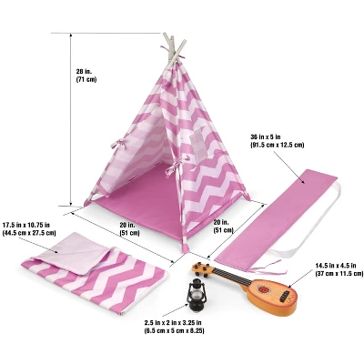 Let the summertime fun begin with our Camping Adventures Doll Tent Set complete with a tent, sleeping bag and pillow, guitar, lantern and storage bag. Stare at the stars and bask in the glow of the moonlight while you and your BFF unplug and enjoy nature. All your friends can gather around the lantern as you strum your guitar, sing your favorite songs, and tell spooky ghost stories. Once the camping fun is over simply fold up the tent and store it inside the handy carry bag, along with all the accessories. Not to be stored outdoors. Sized just right for dolls up to 18 inches including American Girl, My Life As, Madame Alexander, Our Generation, and WellieWishers. Tent: 20 inches L x 20 inches W x 28 inches H. Sleeping bag: 17.5 inches L x 10.75 inches H x 0.5 inches H. Pillow: 7.75 inches L x 3.75 inches W. Guitar: 14.5 inches L x 4.5 inches W x 1.25 inches H. Lantern: 2.5 inches L x 2 inches W x 3.25 inches H. Storage bag: 38 inches L x 6 inches W. Wipe and spot clean as needed. Made of 100% polyester fabric, steel tubing, and plastic. Assembled weight: 2.6 pounds. All measurements approximate. Adult assembly required. Illustrated instructions included. This item is for use with dolls only. /! WARNING: CHOKING HAZARD – Small parts. Not for children under 3 yrs. Product complies with all currently applicable safety standards. Manufacturer’s 30 day limited warranty to the original purchaser. Product may vary slightly from shown and described. Dolls/accessories shown are for illustration purposes only and are not included with the product. Actual color/finish may vary slightly from screen display. This item ships in its original carton that may include a product photo.