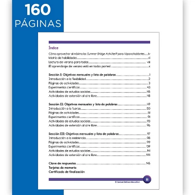 Prevent summer learning loss and prepare your child for back-to-school success in just 15 minutes a day with engaging activities, exercises, fun games, and more � all in one workbook with Summer Bridge Activities Spanish Workbook! This Spanish book helps Spanish-speaking second – third graders keep their skills sharp while learning English during the summer months to stop summer slide through fun practice pages and activities, covering math, science, reading, writing, social studies, fitness, and more. Students practice parts of speech, number patterns, counting money, hands-on science experiments, and other engaging topics, with both activities and directions in Spanish. This Spanish workbook for kids includes flash cards, stickers, and a completion certificate, and features a skill matrix and answer key to track student progress. Each page is numbered by day so kids and parents can track progress and reach monthly learning goals.