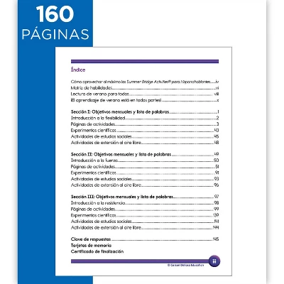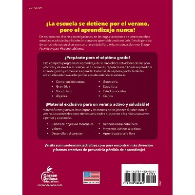 Prevent summer learning loss and prepare your child for back-to-school success in just 15 minutes a day with engaging activities, exercises, fun games, and more � all in one workbook with Summer Bridge Activities Spanish Workbook! This Spanish book helps Spanish-speaking sixth – seventh graders keep their skills sharp while learning English during the summer months to stop summer slide through fun practice pages and activities, covering math, science, reading, writing, social studies, fitness, and more. Students practice with root words, factors, graphing, dictionary skills, social studies, the scientific method, and other engaging topics, with both activities and directions in Spanish. This Spanish workbook for kids includes flash cards and a completion certificate, and features a skill matrix and answer key to track student progress. Each page is numbered by day so kids and parents can track progress and reach monthly learning goals.