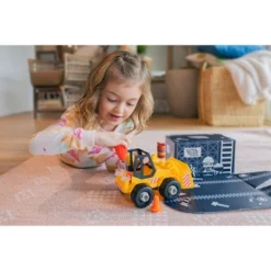 Kids can build a bulldozer all by themselves! Use the handheld screwdriver and colorful bolts to build the bulldozer (and build kid confidence, too!), then unfold the box to create a pretend play construction site. Includes bulldozer with movable scoop bucket, mini screwdriver, 7 bolts, construction worker Bolt Buddy, animal pal, and 2 safety cones.