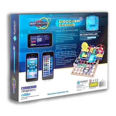 Elenco Snap Circuits Discover Coding | For nearly 20 years, future engineers all over the world have learned basic electricity with Snap Circuits kits. Now, Snap Circuits is taking the next generation into the world of coding! Download the Snap Circuits App and control Snap Circuits projects using your smartphone or tablet to control lights, sounds and a motor! Discover Coding is a great introduction to coding, using easy graphical coding. More advanced coders can move up to BLOCKLY coding.Three ways to control:� Real-time control� Easy-to-use graphical coding� BLOCKLY codeLearn the basics of coding, then code your own patterns of lights, sounds and moving parts.Features:� Learn about circuitry, electronics, and much more!� Illustrated, easy-to-use, full-color project manual explains electrical and coding concepts and includes exciting coding challenges!� Over 30 Snap Circuits parts, including the new Bluetooth-powered SC Controller.� 5 Control Outputs � Control up to 5 circuit paths together or independently to create different circuits and projects.� Ages 8+� 4 AA batteries required but not included