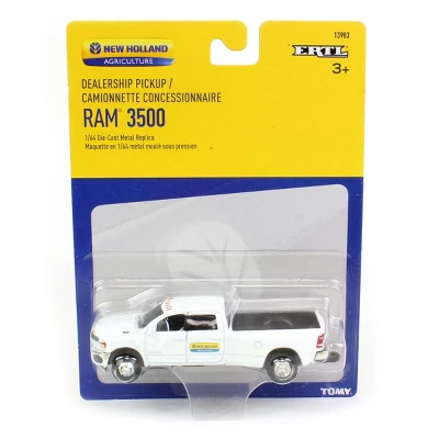 This 1/64 New Holland RAM 3500 Big Horn Dealership Pickup Truck is made by ERTL, the leader in farm toys for over 60 years. This pickup truck features New Holland branding, and it has a quad cab configuration. It features a chrome grille and bumpers, and its bed is painted black to replicate a bed liner. According to the manufacturer, this item is recommended for ages 3+ years, meaning it is great for play!