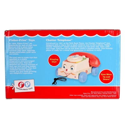 Introduced in 1961, The Fisher Price Chatter Telephone was the ultimate classic pretend play toy with its friendly interactive design. Since then, technology has changed quite a bit, but the Chatter Telephone makes children smile just the same way. With eyes that roll up and down and a rotary dial that rings, this friendly phone is ready for a whole new generation of children to enjoy!