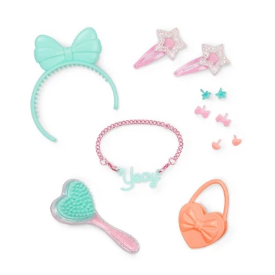 With her pierced ears and colorful, sparkling style, Jas brings fun wherever she goes! This 14-inch doll has beautiful brown eyes and long, silky hair that is both turquoise and pink. Accessorize her to your heart’s content with Jas’ jewelry and hair care accessories. She comes with 3 pairs of earrings that are super easy to switch out: choose between the pair of hearts, stars, and bows to fit her mood! Her charmed necklace is even wearable as a kids’ bracelet, so you can match her! Use the glittery heart-shaped brush to play with her hair, then style it with the bowed headband and shimmering star clips. Then, complete Jas’ look with the heart-shaped purse. Strike a pose by bending Jas’s neck, arms, and legs! Jas’ clothes are easy to change and are compatible with other Glitter Girls accessories for boundless mixing and matching!