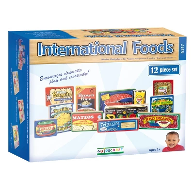 Introduce your children to international cuisine with this wonderful set. These international foods are a great addition to any dramatic play center. Use this set in a lesson about diversity and inclusion. Teach children about the cultures these foods originate from and where they can be found around the world. Each food block has silk-screened retro illustrations on the hardwood. This set includes salsa, tortilla chips, fettuccini, matzo, stir-fry vegetables, swiss cheese, brown rice, salmon, sprouts, bagels, red beans, and fruits juice. Set of 12.