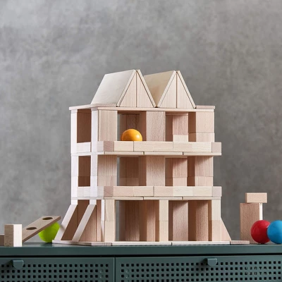 • Perforated slats and brightly-colored spherical blocks bring new building ideas to life. The triangular prism allows for more complex construction – even roof designs can be reinterpreted.