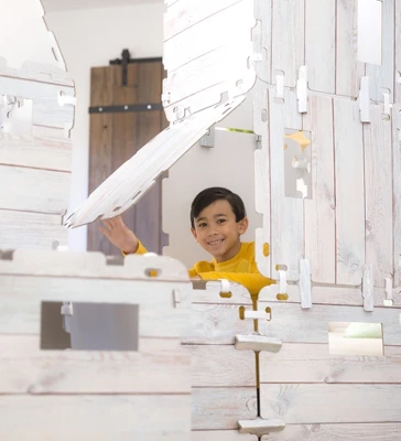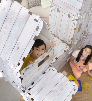 The traditional, clean look of shiplap brings a nautical theme to fort-building fun with our 32-Panel Shiplap Fantasy Forts Kit. Kids can build (and rebuild) their very own fort—no extra pieces needed! Kit includes 32 sturdy cardboard panels (some with window cut-outs), hook and loop tape, and cardboard carton clips for building horizontally. What if your idea of a dream fort changes? Even better! Innovative, double-sided hook and loop tape is easy both to fasten and unfasten, allowing you to endlessly rebuild your fort. Tip-use five panels to create a handy storage spot. A great way for kids to engage in active, imaginative play, indoor or outdoors (please store indoors). Perfect for play dates, parties, or family get-togethers!