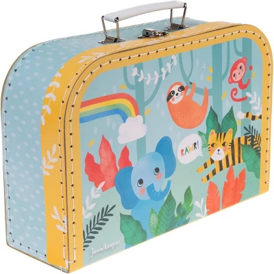 This adorable Jewelkeeper toy tea set is designed for play and encourages young children to use their imaginations and enhance their creativity and social skills. The tea set is decorated with elephants, monkeys, tigers and sloths. Unbreakable tin construction will withstand years of indoor and outdoor tea party fun. The lightweight laminated carry bag makes it easy to transport and store the entire tea set. The bag can also be used to store toys and as room decoration. The ideal birthday or Christmas gift for children.