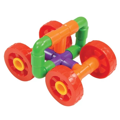 This unique building set adds a new dimension to tube construction — wheels! Children can build endless tube designs and add wheels to make them move. Easy-fit construction, this set includes 26 straight tubes, 26 shaped tubes, 6 tubes, 6 cross tubes, 8 wheels in assorted vibrant colors. This set also comes in a durable stackable storage container.