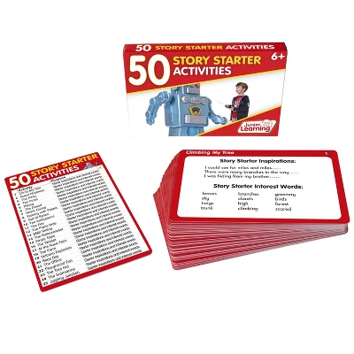 Junior Learning Language Arts Activity Cards, Story Starters | 50 Story Starter Activities is a set of 50 double-sided activity cards for teaching writing through story prompts. Topics include fiction and non-fiction examples. The front side provides story starter inspirations and interested words. The other side provides a visual image of the story. Contains 50 double-sided activity cards and a contents card that can act as a check off list.