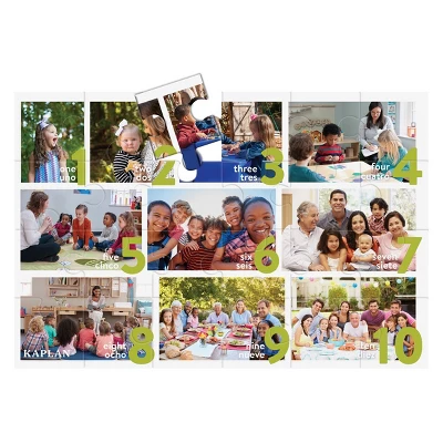 - Puzzle features real photos of diverse families and are labeled in English and Spanish