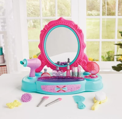 - Product Specifications: Set includes a tabletop vanity, comb, hairbrush, make-up brushes, lipstick, hair dryer, perfume bottles and more. A total of 14 pieces included.