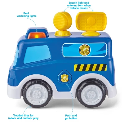 - Fun Lights and Sounds: The Talk & Roll Remote Control Police Van features interactive lights and sounds to really bring your child’s imagination to life. When in motion, the siren on top of the vehicle lights up, and the search light and antenna rotate!