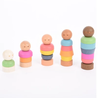 The Rainbow Community People Set includes 5 bolt figures in 5 different sizes and skin tones. It also includes 15 nuts in different sizes and 7 colors: red, orange, yellow, green, blue, indigo and purple. Use the “feet” to screw the nuts in place. Children can screw on the pieces to create unique characters of different colors, shapes and sizes. Use this set to open discussions about inclusion and diversity through play. The simple design and various skin tones mean these figures can represent anyone! Use these colorful figures for imaginative play, color recognition and sorting. Children can improve their fine motor and descriptive language skills as they build new figures every time they play. Use these open-ended figures for role or loose parts play. Made from high-quality materials, these figures are designed to last for years of home or classroom use. The chunky wooden design is also the perfect size for little hands. Includes a cotton storage bag. For ages 4+. Size of heads: 1.3″ dia. Size of bodies: 2.2″H, 2.8″H, 3.3″H, 3.9″H and 4.5″H.The Rainbow Families set includes 16 smooth wooden figures in 4 sizes and varying shades of 4 different colors. This set can open discussions about inclusion and diversity through play. The simple design and absence of facial features mean these figures can represent anyone! Use these colorful figures for imaginative play, color recognition and sorting. Children can improve their fine motor and descriptive language skills as they discover the similarities and differences among the figures. Use these open-ended figures for role or loose parts play. Made from high-quality materials, these figures are designed to last for years of home or classroom use. The chunky wooden design is also the perfect size for little hands. For ages 3+. Size of largest: 3.1″H x 1.1″ dia. Size of smallest: 2″H x 1.1″ dia.The set of 10 natural Beech wood Community Figures peg dolls and the set of 10 natural Beech Woodland Tree figures each feature 10 different shapes. Children can improve their fine motor skills and descriptive language as they discover the similarities and differences among these tactile wooden toys. Made from sustainably sourced European beech trees, young hands will be safe from splinters while feeling the lightweight, smooth surfaces. Use these adorable wooden figures for loose parts play. Allow children to explore on their own terms. Forster problem solving and critical thinking. For ages 18m+. | Size: 2.6″ – 3.1″ peg dolls, 3.3″ – 4.3″ trees.