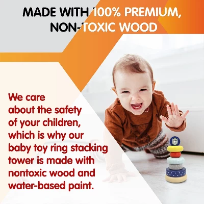 - MADE WITH 100% PREMIUM, NON-TOXIC WOOD: We care about the safety of your children, which is why our baby toy ring stacking tower is made with nontoxic wood and water-based paint. The paint will not come off into your childās mouth or risk contamination.