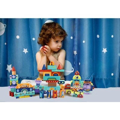 Leo & Friends Universe Creative Blocks are colorful, modern blocks designed to help children recognize assorted colors and patterns while having fun and using their hands to build. These durable building blocks are lightweight, easy to stack, and will last a long time, giving your child plenty of time to create some of their favorite things! GREAT FOR TODDLERS AND YOUNG CHILDREN Both toddlers and young children can enjoy educational, fun play with these bright-colored building blocks that come in various shapes and sizes. Not only can children build while using their hands to create different shapes and neat characters, including robots, but they can also learn their shapes and colors through these creative blocks. BRIGHT COLORS KEEP CHILDREN ENTERTAINED The bright shades of orange, blue, green, red, and more can capture any child’s interest while keeping them engaged. Your child will love seeing the different patterns and putting the pieces of these blocks together to create new things! It’s a great way to spend some quality time with your little one while doing something that expands their knowledge! A FUN WAY TO IMPROVE A CHILD’S FOCUS AND FINE MOTOR SKILLS Help your little one get better at concentrating and staying focused while boosting fine motor skills by playing with these smooth wooden blocks. Kids can focus on what they’re trying to build, working hard to stack the different pieces upon one another to achieve that finished look. WE CARE ABOUT YOUR SAFETY Your safety is our priority. Therefore, we ensure that our products consist of only high-quality materials that are entirely safe for children to use daily without putting the little ones at risk.