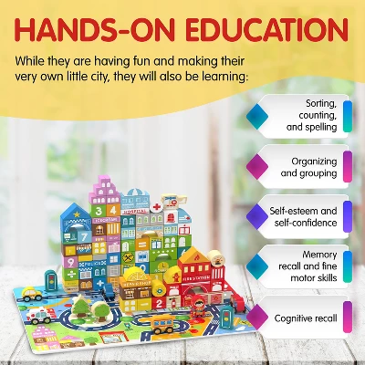 PRODUCT DESCRIPTION:It’s time to watch your kids build the city of their dreams with this expansive 100-Piece Wooden Stacking City Toy Kit. Made with you and your family in mind.HANDS-ON EDUCATIONOur kids are always learning, which is why we’ve created a hands-on toy set that they can grab, sort, move, knock down, stack, and organize, all in one. While they are having fun and making their very own little city, they will also be learning:·Sorting, counting, and spelling·Organizing and grouping·Self-esteem and self-confidence·Memory recall and fine motor skills·Cognitive recallBest of all: they won’t even realize they are learning! That’s the best kind of kid’s toy.YOUR CHILD’S SAFETY IS PARAMOUNTThat’s why our durable city kit is a BPA-free, non-toxic wooden play set that you can feel comfortable sharing with your family. All of our premium wood is 100% non-toxic, lead safe, and phthalate-free.We have tested our product to guarantee your safety.UNLIMITED BUILDING POSSIBILITIESThe sky is the limit in your little city builder’s reality. Watch them make a new kind of city, every single day, for years, never running out of pieces or possible scenarios. It’s the best way to encourage their healthy imaginative and creative development.