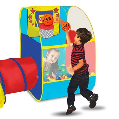 The Little Tikes 6-in-1 Pop Up Fun Zone Tent is the most versatile play tent for your kids next play adventure. The versatility of this item allows it to function as a Arcade Toss Game, Tent, Tunnel, Ball pit, Basketball Hoop and Soccer Goal!. This Fun Zone tent has all the entertainment our kids need to stay active away from the screen. Talk about all-day play with friends and family. Easily set up the Pop-Up Fun Zone Tent with pop up action hinges and attachable poles. Recommended for ages 3+.
