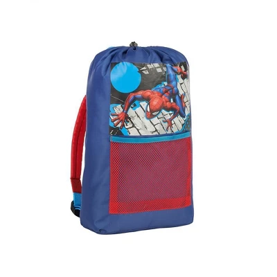 - Roomy drawcord backpack includes padded shoulder straps and a front mesh pocket