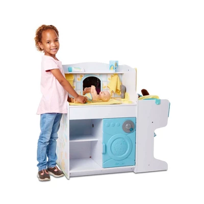 • Wooden multi-functional baby care center with kitchen, bathing and changing area, and nursery (dolls, stuffed animals, and accessories not included); fits dolls and stuffed animals approximately 15 inches to 18 inches tall