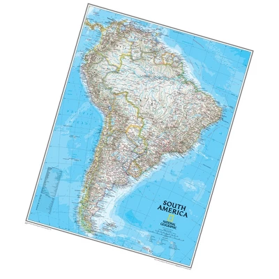 National Geographic Wall Maps | National Geographic’s maps are as attractive as they are functional. The entire continent is rendered in the Classic style with colorful, clearly defined international borders, shaded relief, and easy to read fonts. Place names, bodies of water, airports, major roadways, and railroads, as well as cartographic patterns used to depict sand, lava fields, swamps, dry salt lakes, intermittent lakes, salt deserts, glaciers, and areas below sea level are shown as well. Ocean features and currents, as well as depth curves and soundings add context to the continent’s extensive coastline and the diverse human populations that inhabit those shores and surrounding islands. An inset map provides detail of relevant areas. Scale: 1:13,812,000.The map is encapsulated in heavy-duty 1.6 mil laminate which makes the paper much more durable and resistant to the swelling and shrinking caused by changes in humidity. Laminated maps can be framed without the need for glass, so the fames can be much lighter and less expensive.