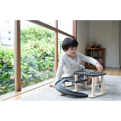 ItÂ’s a fun time for kids to race and park their cars with the PlanToys Race N Play Parking Garage! The garage comes with a helipad on the top floor and multiple parking lots on the multi-level car play set for more fun. The black exterior offers endless creativity for kids to illustratively design their own kind of garage. This set is easy to assemble and made sustainably in Thailand with PlanWood.