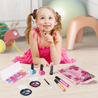 Comes in a soft lovely bag to keep all the accessories tidy and secure and is perfect for compact travel. Includes soft cosmetic brushes, makeup powder, powder brush, eye makeup, eye makeup brush, lipstick and more! Play Cosmetics will easily was off after playtime and hour sof fun. Makeup is composed of non-toxic, high quality ingredients that comply with all U.S. toy safety standards.