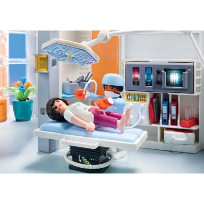 - Set includes four figures, furnished hospital wing, two rolling patient beds, exam bed, stethoscope, medical charts and tools, laptops, magazines, test tubes, microscope, bandage stickers, and many other accessories