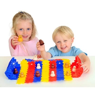 - Contains 124 pieces including 30 triangles, 60 squares, 12 spacers, 4 wheels, 6 axels in 2 different sizes, 6 child figures and 6 adult figures