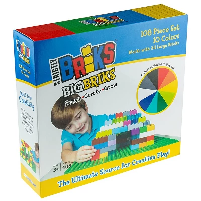 - INCLUDED IN THE SET: This set includes an assortment of Big Bricks in White, Gray, Black, Red, Orange, Yellow, Green, Dark Green, Teal, and Blue. The 108-piece bundle contains 72 Big Bricks measuring 1.25 inch x 1.25 inch x 1 inch (2×2 pegs), and 36 Big Bricks measuring 2.5 inch x 1.25 inch x 1 inch (2×4 pegs). Spread them out on the floor & dive into a world of infinite playtime creativity. Let your building skills soar & construct amazing structures with these versatile Big Briks.