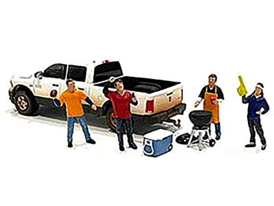 Brand new 1/64 scale diecast models of “Tailgate Party” Diecast Set of 6 pieces (4 Figurines and 2 Accessories) for 1/64 scale models by American Diorama.Limited edition.Brand new box.Made of die-cast metal.Comes in a blister pack.Does not come with the truck shown.Each figurine is approximately 1 inches tall.Only 4 figurines, BBQ grill and cooler will be received.