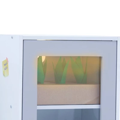 - PRETEND HYDROPONIC FEATURE: The hydroponic garden cabinet features an LED grow light and two planter bed trays for vertical farming plus three cuttable carrots and three felt herbs. Three LR44 batteries included.