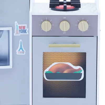 Now little ones can practice growing, cooking, and eating their own organic meals with the Little Chef Lyon Kitchen with Hydroponic Garden Set! This complete kitchen features a gray finish, faux marble countertops, tile print backsplash, and brass hardware for a endless urban-chic style. A pretend hydroponic growing system with LED grow light, two planter beds, three cuttable carrots, and three felt herbs teaches little ones about the future of farming! Accessories include a salt and pepper shaker, pot, lid, pan, spatula, slotted spatula, cup, and three ice cubes. Two reusable sticker sheets are also included for personalization.