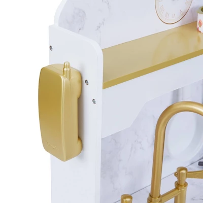 Teamson Kids’ Petite Versailles Play Kitchen gives your little chef a realistic cooking experience. The white finish, gold hardware and gray marble backsplash add a sophisticated style to this classic kitchen set. Interactive details include turning and clicking knobs, analog clock with movable hands and turning faucet levers. The deep farmhouse style sink with gold gooseneck faucet and turning levers provides a space to wash vegetables or clean the dishes. The hooks on the marble backsplash, top shelf and underneath cabinet all provide storage space for cookware and pretend food. Eleven accessories include a phone, pots and pans, spatulas, seasoning and pretend cans of food. The Petite Versailles Classic Play Kitchen measures 19.75″ long, 18.25″ deep, and 35.5″ tall and is recommended for ages 3 years and up.Â