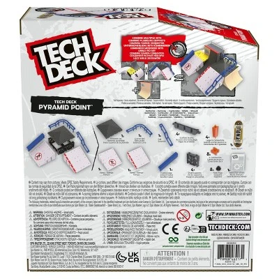 - Includes: 1 Tech Deck Fingerboard, 1 Pyramid Top, 2 Ramps, 1 Curved Rail Rail, 1 Rail, 1 Hubba Ledge, 4 Scaffold Beams, 4 Small Supports, 4 Large X-Connectors, 8 X-Connectors, 8 Foot Pegs, Instruction Sheet
