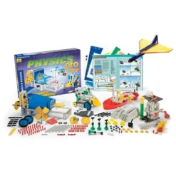 Physics Pro is our biggest, most advanced physics kit. With this kit, you can continue your study of statics and dynamics from previous lessons and begin your study of more advanced topics in physics, including fluid dynamics, energy, oscillation, hydraulics, and pneumatics. By adding advanced topics like fluid dynamics to your physics repertoire, you can now build some really spectacular models and devices, such as a wind tunnel, pneumatic shocks, and a hydraulic lift. You will see how physics extends far beyond the classroom, giving us an amazing set of tools that can be applied in the real world to engineer marvelous things. The main focus of the kit is the behavior of the two most important fluids in our world — water and air — and objects immersed in them. You will investigate how air and water rest and flow, what they can carry and how they move. With experiments and models, you will find out what forces work on them and what kinds of energy they possess. You will learn how ships float and airplanes fly, why a streamlined shape lets a car drive faster and how power plants convert a current of water into electrical current. The 96-page, full-color experiment manual has two major sections. In the first part, you will enter the physics lab, where you will get to know the properties of air and water and become familiar with currents and energy. There is a series of 17 experiments in which you will start building smaller models. In the second part, you will move on to the workshop, where you will build 14 larger models of complex real-world devices. More than 212 parts are included in this kit, which are compatible with our other Physics kits.