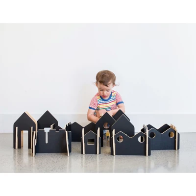 Create your own cities and towns with this Happy Architect set! Made of smooth Birch plywood, this 28-piece wooden play set is suitable for ages 2+. An open-ended activity for unstructured play, these blocks feature black surfaces to draw on with chalk (not included). The non-black side is coated with non-toxic lacquer. The pieces feature pre-cut grooves for easy set up. Sizes range from 9. 7�L x 5. 7�W to 5. 7�L x 4. 6�W.