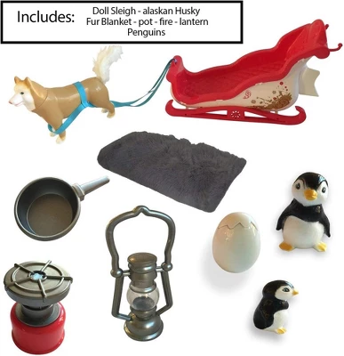 This holiday let’s take a ride to the North pole…Outfit dolly in her warm winter gear, cuddle her in a warm fur blanket, and off you go. This 18-inch doll set is perfect for a holiday gift for any doll lover. The set includes a winter sleigh, blanket, Alaskan Husky, 3 Penguins, lantern, and furnace. It’s a great accessory for 18-Inch dolls. Manufactured by The New York Doll Collection, a modern Company for dolls and kids.
