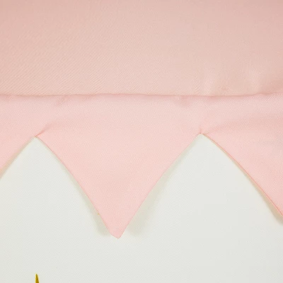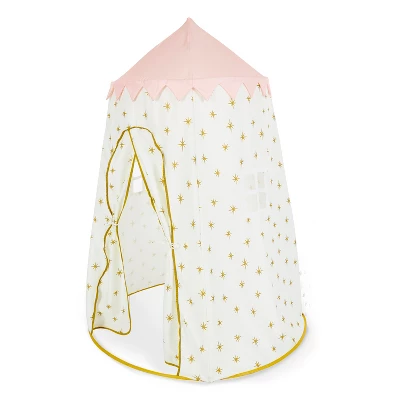 - Features fun design with windows, gold stars on white walls, and a pink canopy